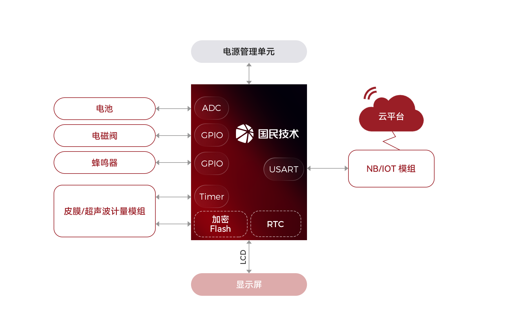 • 通过USART连接到NB-IOT等通信模块,用于数据交互及平台对终端设备的实时控制