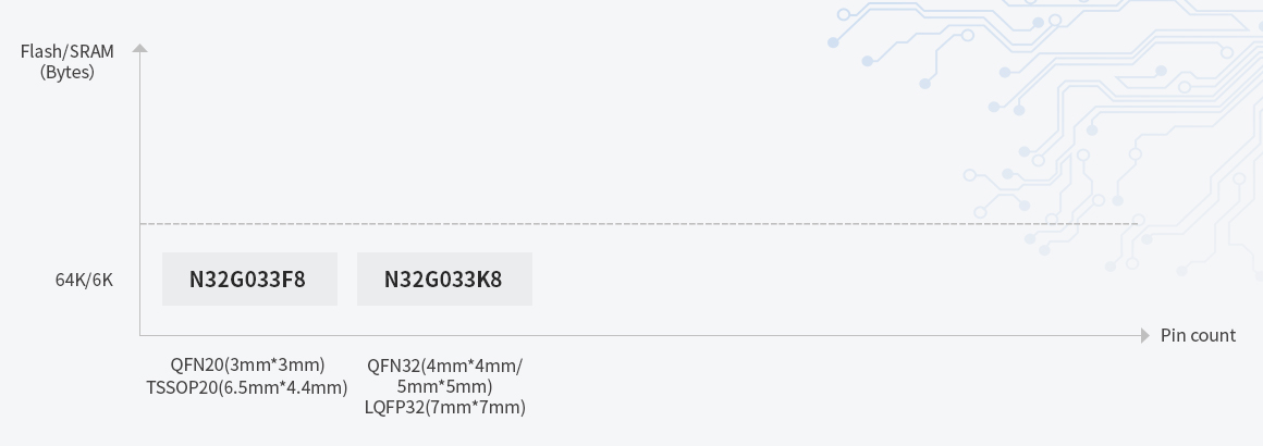 N32G033系列采用32 bit Arm® Cortex®-M0内核,最高工作主频64MHz,集成多达64KB Flash,8KB SRAM,1个12bit 1Msps ADC,3个OPAMP,1个COMP,集成多路U(S)ART、I2C、SPI通信接口。
