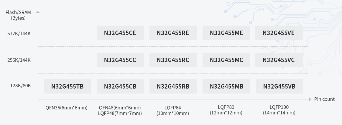 N32G455系列(通用增强型)采用32 bit Arm® Cortex®-M4F内核,支持浮点运算和DSP指令,高达512KB片内Flash,144KB SRAM,集成多达17个高性能模拟器件,18个数字通讯接口,内置10余种密码算法硬件加速引擎,支持存储加密、用户分区保护、安全启动等多种安全特性。