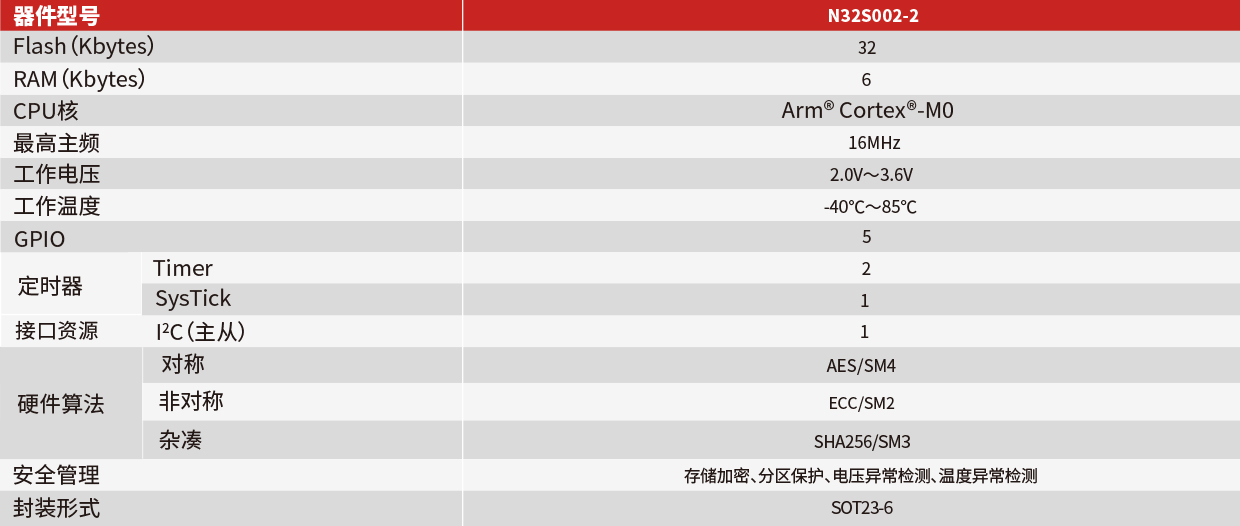 N32S002采用 32 bit ARM Cortex-M0内核,最高工作主频16MHz,集成多达32KB Flash,6KB SRAM,支持2路16/32bit定时器,集成I2C通信接口,内置密码算法硬件加速引擎 。芯片通过商密二级与EAL4+安全认证。