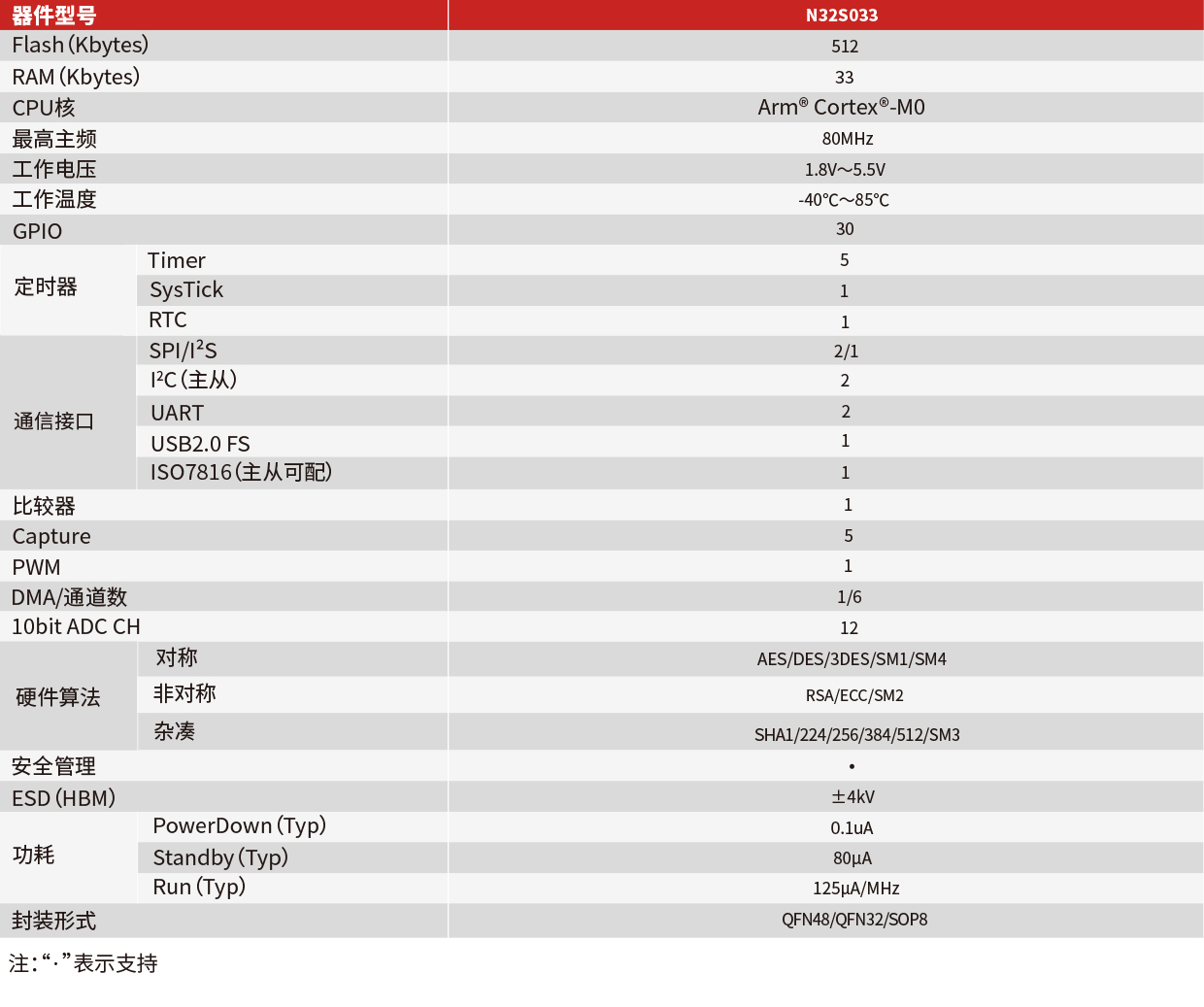 N32S033安全芯片采用 32 bit Arm® Cortex®-M0内核,最高工作主频80MHz,集成多达512KB Flash,32KB+1KB SRAM,1个10bit 1Msps ADC,1个COMP,1个PWM输出,支持多达5路32bit定时器,集成USB、UART、I2C、SPI、I2S、SCC、SCD通信接口,内置密码算法硬件加速引擎。芯片通过EAL4+安全认证。