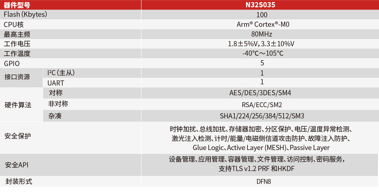 N32S035采用 32 bit ARM Cortex-M0内核,最高工作主频80MHz,用户可用空间100KB Flash,集成UART 和I2C通信接口,以及用于加密算法的内置硬件加速引擎 。